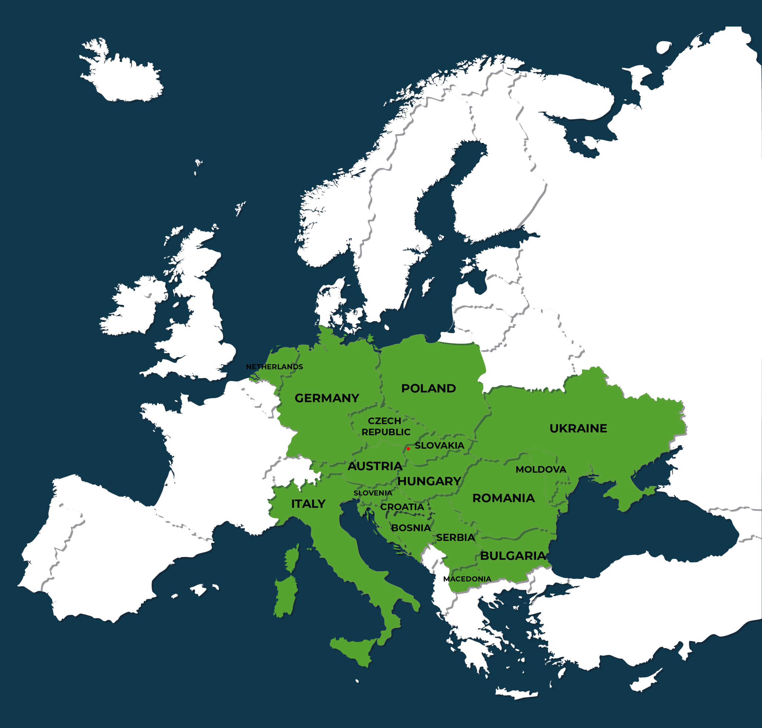 v Slovenské republice, České republice, Maďarsku, na Ukrajině, v Rakousku, Chorvatsku, Srbsku, Bosně a Hercegovině, Slovinsku, Severní Makedonii, Bulharsku, Rumunsku, Moldavsku, Polsku, Nizozemsku, Německu a Itálii.
